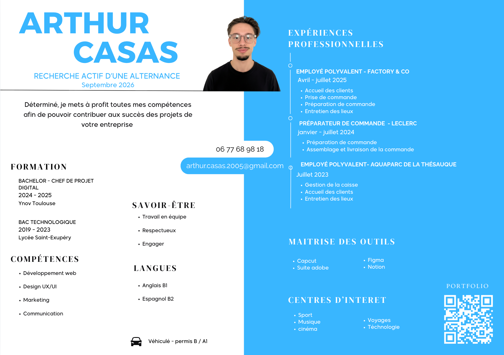 Mon CV retrace mon évolution, il met en avant les expériences qui m’ont permis de grandir ainsi que les compétences que je continue à développer, avec l’ambition de construire pas à pas mon avenir professionnel.